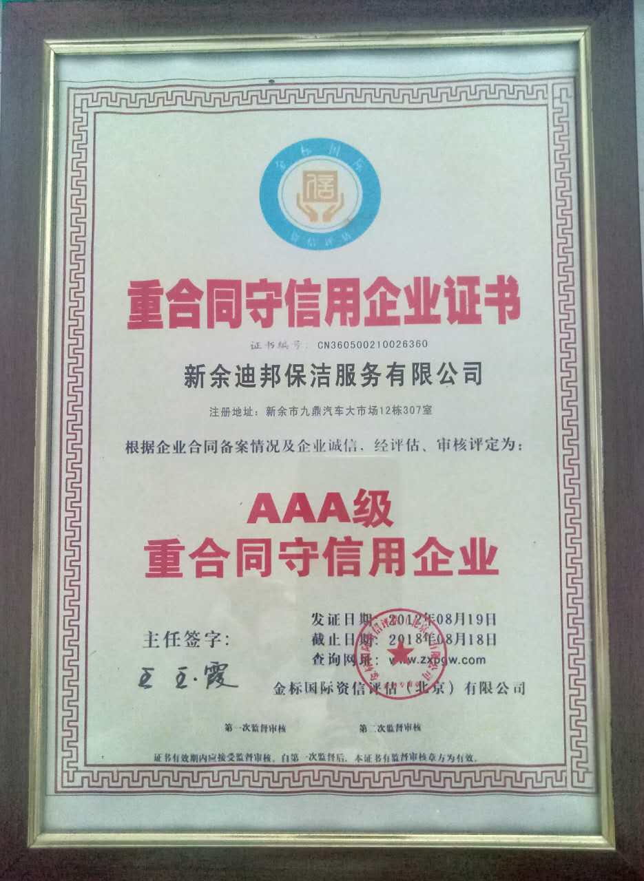 新余迪邦保潔服務有限公司獲得北京金標國際資信有限公司評為AAA級重合同守信用企業