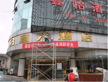 迪邦保潔公司保潔人員正在為“分宜大酒店”做高空外墻清洗。