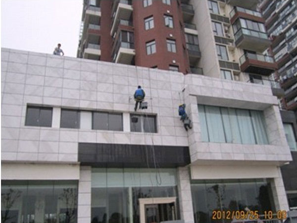 迪邦保潔公司保潔人員正在為“一水天城銷售中心”做外墻清洗工程。