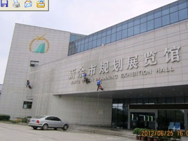 迪邦保潔公司保潔人員正在為“新余市規劃展覽館”做高空外墻清洗。